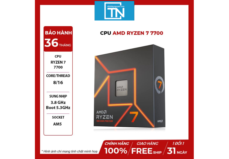 (6 nhân/12 luồng, Boost 4.6GHz, 32MB Cache L3). Ryzen 7 7700X (AM5) là
